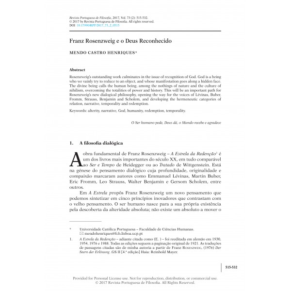 Mendo Castro Henriques, “Franz Rosenzweig e o Deus Reconhecido,” Revista Portuguesa de Filosofia 73, no. 2 (2017): 515–32, DOI 10.17990/rpf/2017_73_2_0515