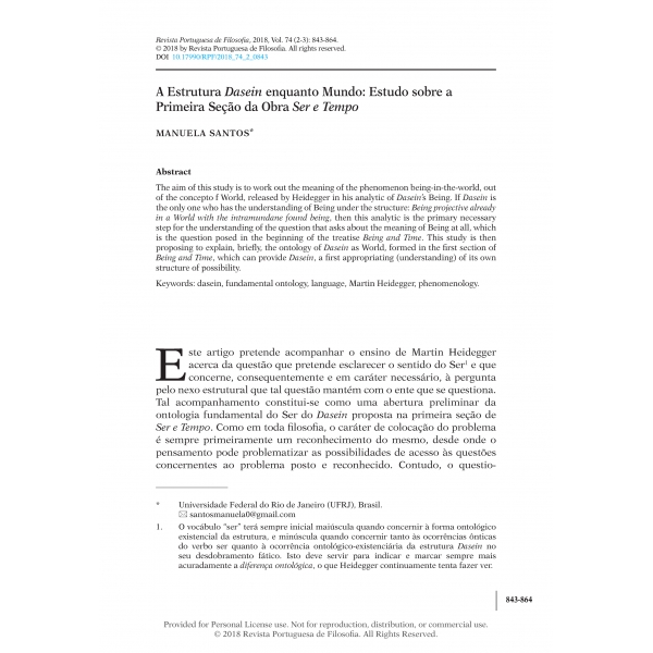 Manuela Santos, “A Estrutura Dasein enquanto Mundo: Estudo sobre a Primeira Seção da Obra Ser e Tempo,” Revista Portuguesa de Filosofia 74, no. 2–3 (2018): 843–64, DOI 10.17990/RPF/2018_74_2_0843.