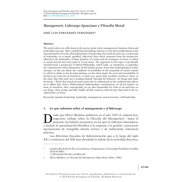 José Luis Fernández Fernández, “Management, Liderazgo Ignaciano y Filosofía Moral,” Revista Portuguesa de Filosofia 74, no. 2–3 (2018): 473–508, DOI 10.17990/RPF/2018_74_2_0473.
