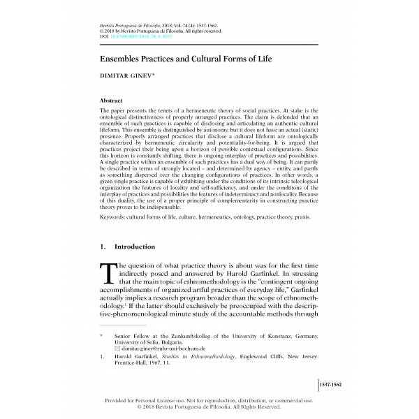 Dimitar Ginev, “Ensembles Practices and Cultural Forms of Life,” Revista Portuguesa de Filosofia 74, no. 4 (2018): 1537–62, https://doi.org/10.17990/RPF/2018_74_4_1537.