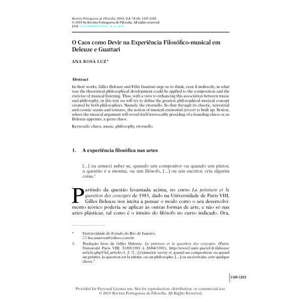 Ana Rosa Luz, “O Caos como Devir na Experiência Filosófico-musical em Deleuze e Guattari,” Revista Portuguesa de Filosofia 74, no. 4 (2018): 1185–1202, https://doi.org/10.17990/RPF/2018_74_4_1185.
