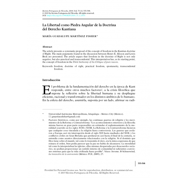 Martínez Fisher, María Guadalupe, “Reflexiones en torno a la Doctrina Kantiana del Derecho Natural”, en Los rostros de la razón. Immanuel Kant desde Hispanoamérica, II Filosofía Moral, Política y del Derecho, ed. Gustavo Leyva, Álvaro Pelaez y Pedro Stepanenko. España: Anthropos, 2018.