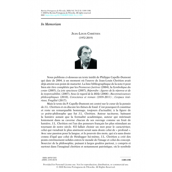 Emmanuel Tourpe, “In Memoriam. Jean-Louis Chrétien (1952-2019),” Revista Portuguesa de Filosofia 76, no. 2–3 (2020): 1189–90, https://doi.org/10.17990/RPF/2020_76_2_1189.