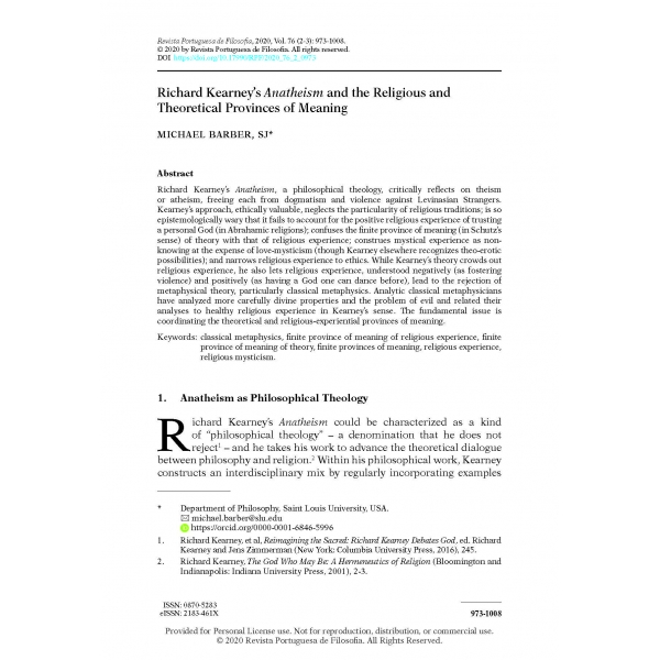 Michael Barber, “Richard Kearney’s Anatheism and the Religious and Theoretical Provinces of Meaning,” Revista Portuguesa de Filosofia 76, no. 2–3 (2020): 973–1008, https://doi.org/10.17990/RPF/2020_76_2_0973.