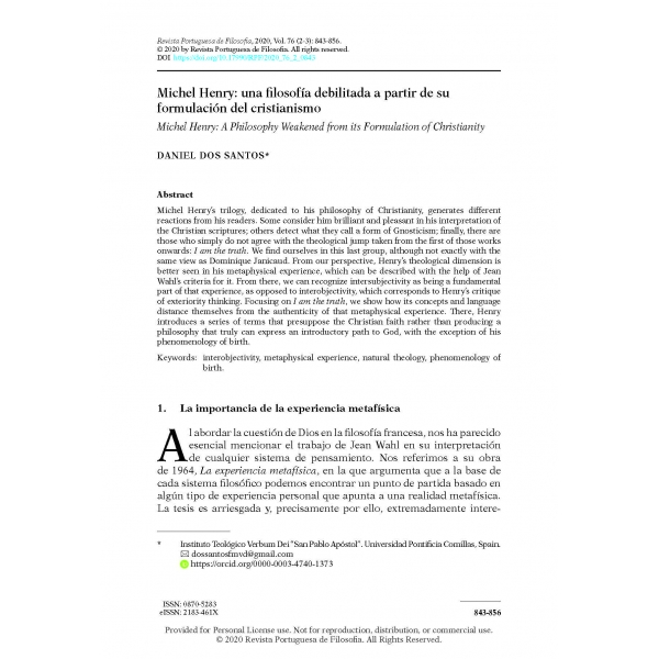 Dos Santos, Daniel Ferreira. El descubrimiento metafísico del hombre en Michel Henry. Madrid: PUC, 2016. https://repositorio.comillas.edu/xmlui/handle/11531/15417.