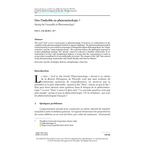 Paul Gilbert, “Dire l’indicible en phénoménologie ?,” Revista Portuguesa de Filosofia 76, no. 2–3 (2020): 729–60, https://doi.org/10.17990/RPF/2020_76_2_0729.