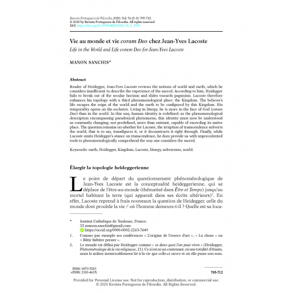 Manon Sanchis, “Vie au monde et vie coram Deo chez Jean-Yves Lacoste,” Revista Portuguesa de Filosofia 76, no. 2–3 (2020): 705–12, https://doi.org/10.17990/RPF/2020_76_2_0705.
