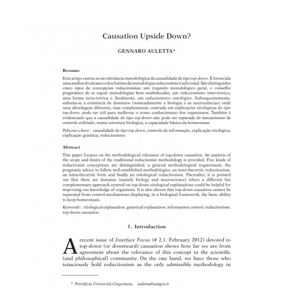 | Abstract | Resumo Este artigo centra-se na relevância metodológica da causalidade de tipo top-down. É fornecida uma análise do alcance e dos limites da metodologia reducionista tradicional. São distinguidos cinco tipos de concepções reducionistas: um requisito metodológico geral, o conselho pragmático de se seguir metodologias bem estabelecidas, um reducionismo inter-teórico, uma forma intra-teórica e, finalmente, um reducionismo ontológico. Subsequentemente, salienta-se a existência de domínios (nomeadamente a biologia e as neurociências) onde uma abordagem diferente, mas complementar, centrada em explicações etiológicas de tipo top-down, pode ser útil para melhorar o nosso conhecimento dos organismos. Também é evidenciado que a causalidade de tipo top-down não pode ser separada de mecanismos de controle exibindo, numa estrutura biológica, a capacidade básica da homeostase. Palavras-chave : causalidade de tipo top-down, controlo de informação, explicação etiológica, explicação genética, reducionismo Abstract This paper focuses on the methodological relevance of top-downcausation. An analysis of the scope and limits of the traditional reductionist methodology is provided. Five kinds of reductionist conceptions are distinguished: a general methodological requirement, the pragmatic advice to follow well-established methodologies, an inter-theoretic reductionism, an intra-theoretic form and finally an ontological reductionism. Thereafter, it is pointed out that there are domains (namely biology and neuroscience) where a different but complementary approach centred on top-down etiological explanations could be helpful for improving our knowledge of organisms. It is also shown that top-down causation cannot be separated from control-mechanisms displaying, in a biological framework, the basic ability to keep homeostasis. Keywords : etiological explanation, genetical explanation, information control, reductionism, top-down causation |