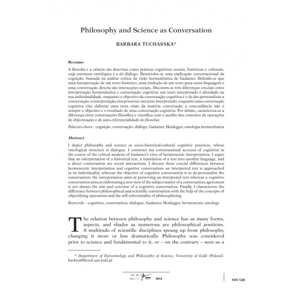 | Abstract | Resumo A filosofia e a ciência são descritas como práticas cognitivas sociais, históricas e culturais, cuja estrutura ontológica é a do diálogo. Desenvolve-se uma explicação conversacional da cognição, baseada na análise crítica da visão hermenêutica de Gadamer. Defende-se que uma interpretação de um texto histórico, uma tradução de um texto para outra linguagem e uma conversação directa são interacções sociais. Discutem-se três diferenças cruciais entre interpretação hermenêutica e conversação cognitiva: um texto interpretado é abordado na sua individualidade, enquanto o objectivo da conversação cognitiva é o de des-personalizar a conversação; a interpretação visa preservar um texto interpretado, enquanto uma conversação cognitiva visa elaborar uma nova visão da matéria conversada; a concordância não é sempre o objectivo e o resultado de uma conversação cognitiva. Por último, caracteriza-se a diferença entre conversações filosófica e científica com o auxílio dos conceitos de operações de objectivação e de auto-referencialidade do filosofar. Palavras-chave : cognição, conversação, diálogo, Gadamer, Heidegger, ontologia hermenêutica Abstract I depict philosophy and science as socio-historical-cultural cognitive practices, whose ontological structure is dialogue. I construct my conversational account of cognition in the course of the critical analysis of Gadamer’s view of hermeneutic interpretation. I argue that an interpretation of a historical text, a translation of a text into another language, and a direct conversation are social interactions. I discuss three crucial differences between hermeneutic interpretation and cognitive conversation: an interpreted text is approached in its individuality, whereas the objective of cognitive conversation is to de-personalize the conversation; the interpretation aims at preserving an interpreted text whereas a cognitive conversation aims at elaborating a new view of the subject matter of a conversation; agreement is not always the aim and outcome of a cognitive conversation. Finally, I characterize the difference between philosophical and scientific conversation with the help of the concepts of objectifying operations and the self-referentiality of philosophizing. Keywords : cognition, conversation, dialogue, Gadamer, Heidegger, hermeneutic ontology |