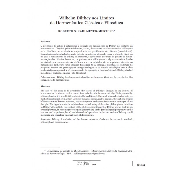 Abstract The aim of the essay is to determine the status of Dilthey's thought in the context of hermeneutics. It aims to to determine, first, whether the hermeneutics by Dilthey would be philosophical or if it would still be classical (= traditional). The work also seeks to characterize the historical situation in which Dilthey’s thoughts settles, and to present, through the project of foundation of human sciences, his assumptions and some fundamental concepts of his thought. The hypotheses to be validated are the following: a) there is a philosophical intuition in Dilthey’s thought; b) the content of the philosophical thought of Dilthey shows itself in his critical purpose, in his ontognoseological concern and in the psychological perspective in the late work of the philosopher. c) in their mode of operation, the hermeneutics of Dilthey is still methodic and therefore classical (non-philosophical). Keywords : Dilthey, foundation of the human sciences, Gadamer, hermeneutic method, philosophical hermeneutics