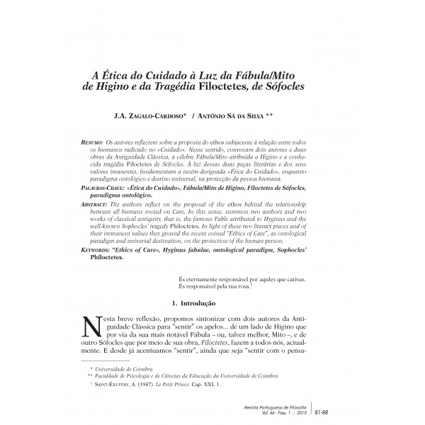 > A Ética do Cuidado à Luz da Fábula/Mito de Higino e da Tragédia Filoctetes de Sófocles