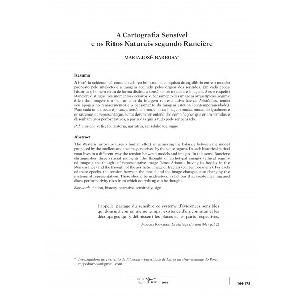 Abstract | Resumo A história ocidental dá conta do esforço humano na conquista do equilíbrio entre o modelo proposto pelo intelecto e a imagem acolhida pelos órgãos dos sentidos. Em cada época histórica o homem viveu de forma distinta a tensão entre modelos e imagens. A esse respeito Rancière distingue três momentos decisivos: o pensamento das imagens arquetípicas (regime ético das imagens); o pensamento da imagem representativa (desde Aristóteles, tendo seu apogeu no renascimento) e o pensamento da imagem estética (contemporaneidade). Para cada uma dessas épocas, a tensão do modelo e da imagem muda, mudando igualmente os sistemas de representação. Estes devem ser entendidos como ficções que criam sentidos e desenham ritos performativos, a partir das quais tudo pode ser pensado. Palavras-chave: ficção, história, narrativa, sensibilidade, signo Abstract The Western history realizes a human effort in achieving the balance between the model proposed by the intellect and the image received by the sense organs. In each historical period man lives in a different way the tension between models and images. In this sense Rancière distinguishes three crucial moments: the thought of archetypal images (ethical regime of images), the thought of representative image (since Aristotle having its heyday in the Renaissance) and the thought of the aesthetic image or fractals (contemporaneity). For each of these epochs, the tension between the model and the image changes, also changing the systems of representation. These should be understood as fictions that create meaning and draw performativity rites from which everything can be thought. Keywords: fiction, history, narrative, sensitivity, sign |