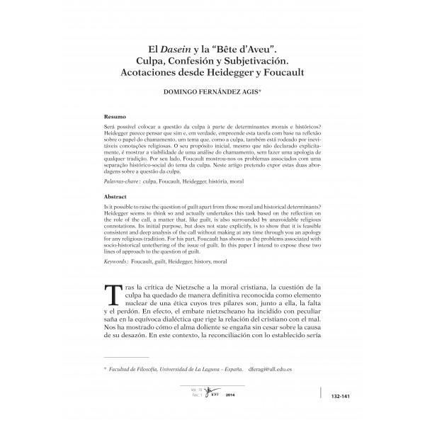 Abstract Resumo Será possível colocar a questão da culpa à parte de determinantes morais e históricos? Heidegger parece pensar que sim e, em verdade, empreende esta tarefa com base na reflexão sobre o papel do chamamento, um tema que, como a culpa, também está rodeado por inevitáveis conotações religiosas . O seu propósito inicial, mesmo que não declarado explicitamente, é mostrar a viabilidade de uma análise do chamamento, sem fazer uma apologia de qualquer tradição. Por seu lado, Foucault mostrou-nos os problemas associados com uma separação histórico-social do tema da culpa. Neste artigo pretendo expor estas duas abordagens sobre a questão da culpa. Palavras-chave : culpa, Foucault, Heidegger, história, moral