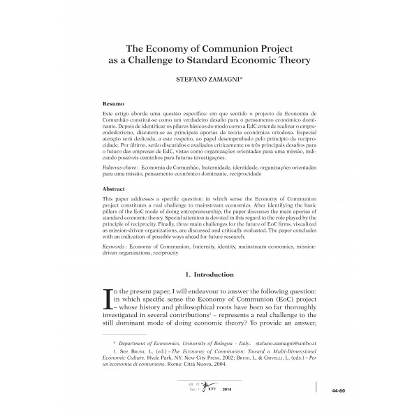 Zamagni, Stefano. “The Economy of Communion Project as a Challenge to Standard Economic Theory.” Revista Portuguesa de Filosofia 70, no. 1 (2014): 44–60. DOI 10.17990/RPF/2014_70_1_0044.