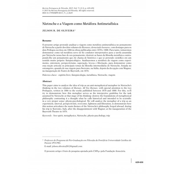 Oliveira, Jelson R. de - “Nietzsche e a Viagem como Metáfora Antimetafísica”. In: Revista Portuguesa de Filosofia, Vol. 71, N. 2-3, 2015, pp. 629-650.