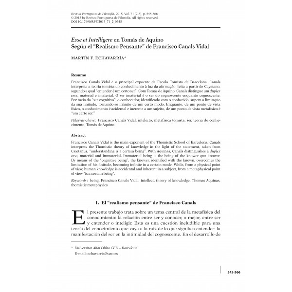 Echavarría, Martín F. - “Esse et intelligere en Tomás de Aquino según el “realismo pensante” de Francisco Canals Vidal”. In: Revista Portuguesa de Filosofia, Vol. 71, N. 2-3, 2015, pp. 545-566.