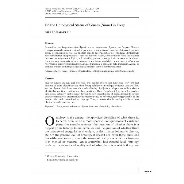 Bar-Elli, Gilead - “On the Ontological Status of Senses (Sinne) in Frege”. In: Revista Portuguesa de Filosofia, Vol. 71, N. 2-3, 2015, pp. 287-306.