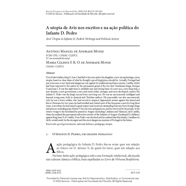 António Manuel de Andrade Moniz and Maria Celeste F. R. O. de Andrade Moniz, “A utopia de Avis nos escritos e na ação política do Infante D. Pedro,” Revista Portuguesa de Humanidades 24, no. 1–2 (2020): 103–16.