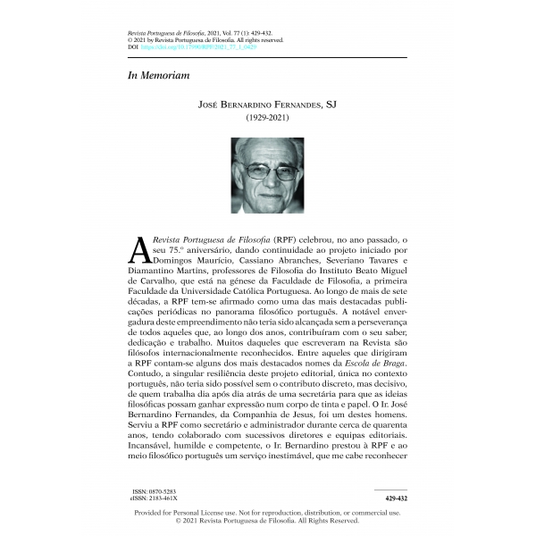 Bruno Nobre, “In Memoriam. José Bernardino Fernandes, SJ (1929-2021),” Revista Portuguesa de Filosofia 77, no. 1 (2021): 429–32, https://doi.org/10.17990/RPF/2021_77_1_0429.
