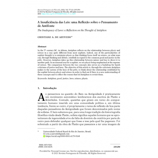 Darbo-Peschanski, Catherine. Antiphon : la nature avec la loi et sans l’ intérêt personnel, Philosophie Antique, n.13 , (2013), 173-223.