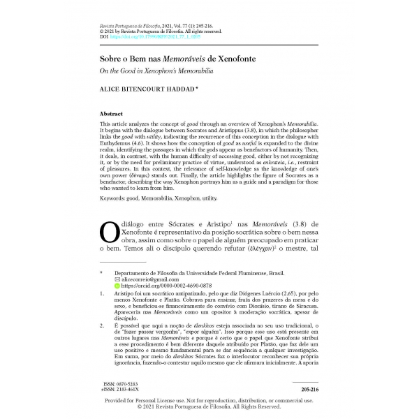 Alice Bitencourt Haddad, “Sobre o Bem nas Memoráveis de Xenofonte,” Revista Portuguesa de Filosofia 77, no. 1 (2021): 205–16, https://doi.org/10.17990/RPF/2021_77_1_0205.