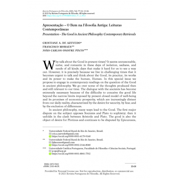 Finally, we hope that the articles presented here will contribute to deepen the reflections about the good and its actuality. We thank the authors for having contributed to this discussion, highlighting all the richness and scope of the issues related to the theme.