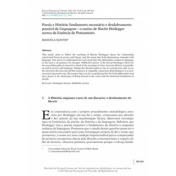 Manuela Santos, “Poesia e História: fundamento necessário e desdobramento possível da Linguagem – o ensino de Martin Heidegger acerca da Essência do Pensamento,” Revista Portuguesa de Filosofia 72, no. 2–3 (2016): 807–18, DOI 10.17990/RPF/2016_72_2_0807.