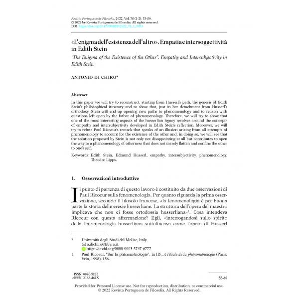 Antonio Di Chiro, “«L’enigma dell’esistenza dell’altro». Empatia e intersoggettività in Edith Stein,” Revista Portuguesa de Filosofia 78, no. 1–2 (2022): 53–80, https://doi.org/10.17990/RPF/2022_78_1_0053.