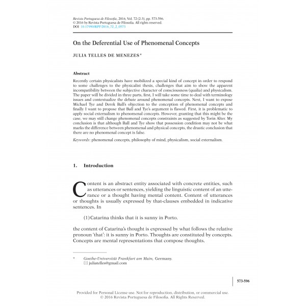 Julia Telles de Menezes, “On the Deferential Use of Phenomenal Concepts,” Revista Portuguesa de Filosofia 72, no. 2–3 (2016): 573–96, DOI 10.17990/RPF/2016_72_2_0573.