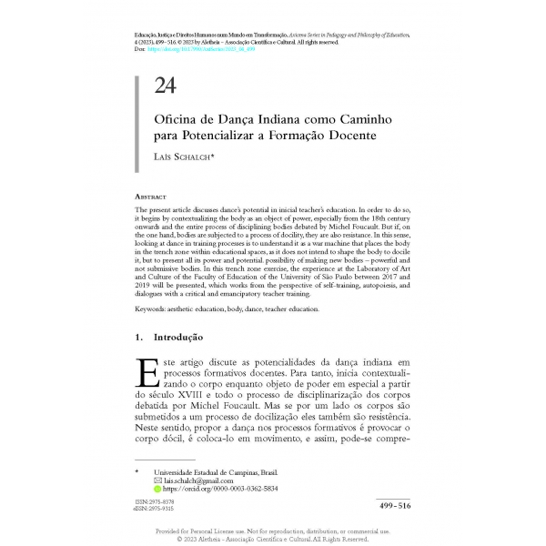 Laís Schalch, “Oficina de Dança Indiana como Caminho para Potencializar a Formação Docente,” in Educação, Justiça e Direitos Humanos: Num Mundo Em Transformação, ed. Carlos V. Estêvão et al., Axioma Series in Pedagogy and Philosophy of Education 4 (Braga: Axioma - Publicações da Faculdade de Filosofia, 2023), 499–516, https://doi.org/10.17990/AxiSeries/2023_04_499.