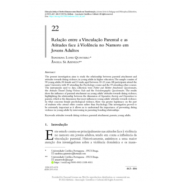 Moura, Octávio and Paula Mena Matos. “Vinculação aos pais, divórcio e conflito interparental em adolescentes.” Psicologia 22, no. 1 (janeiro 2008), http://dx.doi.org/10.17575/rpsicol.v22i1.341.