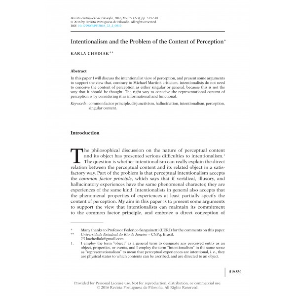 Karla Chediak, “Intentionalism and the Problem of the Content of Perception,” Revista Portuguesa de Filosofia 72, no. 2–3 (2016): 519–30, DOI 10.17990/RPF/2016_72_2_0519.