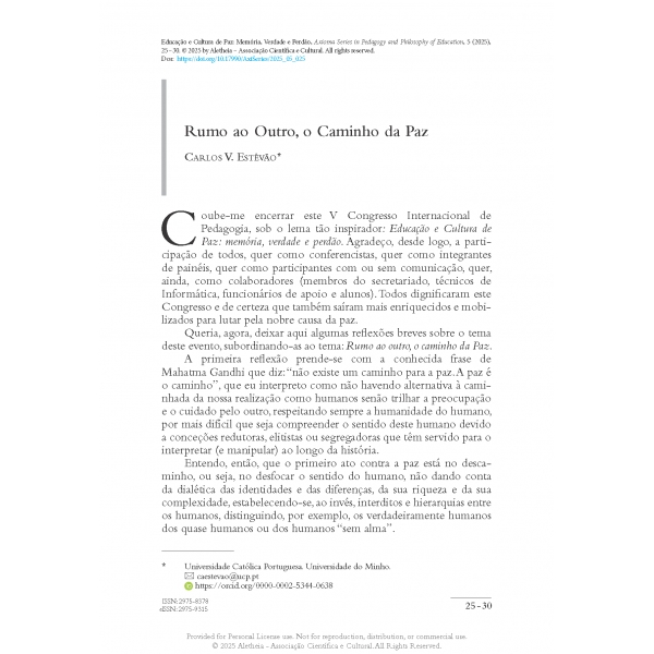 Carlos V. Estêvão, “Rumo ao Outro, o Caminho da Paz,” in Educação e Cultura de Paz: Memória, Verdade e Perdão, 1st ed., ed. Carlos V. Estêvão et al., Axioma Series in Pedagogy and Philosophy of Education 5 (Braga: Axioma - Publicações da Faculdade de Filosofia, 2025), 25–31, https://doi.org/10.17990/AxiSeries/2025_05_025.