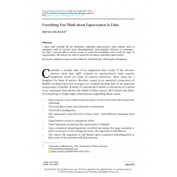 Bryan Frances, “Everything You Think about Equivocation Is False,” Revista Portuguesa de Filosofia 81, no. 4 (2025): 1251–72, https://doi.org/10.17990/RPF/2025_81_4_1251.